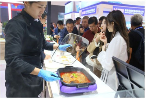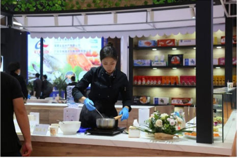 展會(huì)期間,產(chǎn)品展示區(qū)展示的水產(chǎn)品宛如“大賣場(chǎng)”琳瑯滿目,吸引客戶駐足咨詢;展位設(shè)有試吃品鑒區(qū),展示了豐富多樣的試吃品,椒麻小酥魚、鱈魚頭、酸菜魚、泡椒魚皮,一道道美食飄香四溢,現(xiàn)場(chǎng)試吃品嘗人群把展臺(tái)圍得水泄不通。